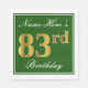 Este simples e elegante design de guardanapo de papel apresenta uma mensagem como "83.º Aniversário do Nome-Aqui" (com o "83.º" a ter uma coloração falsa em ouro) dentro de uma área quadrada de cor verde, com um contorno de fronteira simples. O nome está em um texto semelhante a script de cor branca e pode ser personalizado. Napkins como estes poderia talvez ser usado numa festa de aniversário para alguém que comemora seu oitenta e terceiro aniversário. [~Z0000137]