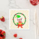 Elfo de Natal bonito segurando uma caixa de presentes no centro de uma coroa de pínus ornamentada com ouro e bolas vermelhas cercadas por estrelas Paper Napkin. Tenha um Natal maravilhoso!