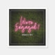 Letreiro de neon rosa inspirado em "Estamos noivos" sobre fundo de verde boxwood com texto e acabamento branco.