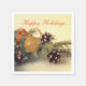 Estilo Retro Decorações de Natal Feriadas Papel de Cocktail Standard Napkins. Um pequeno galho de árvore com cones, um ornamento de bola reluzente de ouro, e um pedaço encaracolado de fita laranja com os cumprimentos "Felizes Feriados".