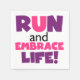 Se você gosta de correr, correr 5Ks, 10Ks, meia maratona, ou maratonas, você vai adorar este design de texto colorido em roxo e rosa que lê Run and Embrace Life! Correr e Abraçar T-shirts, bolsas, canecas, cartões, autocolantes, iPhone e outras capas de dispositivos eletrônicos, ímãs, conselhos de apagar a seco, relógios, travesseiros decorativos, placas de papel e guardanapos, guardas, e muito mais!