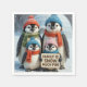 Uma família encantadora de pinguins se mantém unida, cada uma adorada com chapéus e cachecóis coloridos e segurando uma placa divertida.