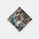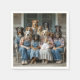A group of dogs is dressed in human clothing, sitting together on a porch in a family portrait style