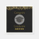 Guardanapos de papel com texto que diz : Felicita o Formando. Escrito em uma fonte na moda de cor dourada. Ilustrado com um boné de formatura com um círculo branco semitransparente atrás. Colocado sobre um fundo preto. Confete brilhante de cor dourada esprinked na parte superior. Classe de 20xx na base para ser personalizada com o ano.