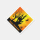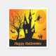 Guardanapo de papel branco com fundo de casa assombrado e fonte laranja de Feliz Halloween.