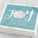 Esta design apresenta uma elegante placa de papel simples para praia de Natal com um tema de vida oceânica náutica costeira, uma tala minimalista de alegria de areia, letra de roteiro de caligrafia de na moda, ilha tropical azul de turquesa, com um texto único para tipografia simples moderna, papel descartável para praia de Natal, material de festas de Natal, com conchas marítimas costeiras, férias de Natal simples e simplista