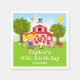Este guardanapo fofo e divertido apresenta uma garota de cabelo loiro com pele clara ao lado de um celeiro vermelho com um cata-vento de galo. Há adoráveis animais de fazenda, como uma vaca, porco e galinha. Ao fundo, há um céu azul brilhante, macieiras, sol, borboletas e margaridas. O texto combina fontes negrito e sem serifa para um visual elegante e moderno. Isso é perfeito para uma festa de aniversário com tema de fazenda.