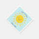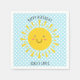Os guardanapos bonitos do sol personalizados com um nome para uma festa de aniversário infantil ou personalizados para qualquer evento com um rosto sorridente e feixes de sol ouro amarelos em um fundo azul-céu e bolinhas brancas.