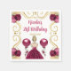 Este convite de guardanapo de aniversário apresenta uma elegante estrutura de ouro, uma bela princesa com cabelo louro e um vestido vermelho burgundy, flores e um balão. Isto é perfeito para uma festa de aniversário.