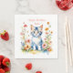 Um doce gatinho listrado cercado por flores cor-de-rosa e coral ilustração aquosa festa de aniversário guardanapos de papel personalizados para uma garotinha.