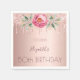 Um guardanapo para uma festa de aniversário feminina e glamourosa 50ª (ou qualquer idade). Um fundo rosa de ouro com pingos, pintura pingando e uma rosa-rosa grande, flor com folhas verdes. O texto: O nome é escrito em ouro rosa escuro com uma escrita de estilo moderna, escrita à mão. Personalize e adicione um nome, 50 anos e uma data.