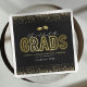 Núcleos de festa de formatura de junção elegantes, com fundo na moda preto, brilho falsa do ouro, o ditado "vamos celebrar os formandos" em um roteiro e um sinal de neon dourado, bonés de folha de ouro falsa, de folha de ouro, seus nomes, a escola/faculdade que frequentaram e o ano de aula.