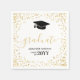 Estes guardanapos de papel festa de formatura preto-na moda, branco e ouro têm a palavra "formando" na letra do roteiro de caligrafia moderna, com o nome do formando e a classe do ano, e um boné de formando no topo. Há uma estrutura de falso confete dourado à volta da borda.