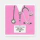 Os guardanapos de festa de formatura da Faculdade de Medicina, com esfregões de hospital cor-de-rosa, um estetoscópio e faca suíça. Para personalizar o texto de edição para adicionar o nome do médico.