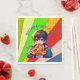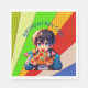 Os guardanapos de papel personalizados para a festa de aniversário de pizza de um menino. Menino de anime bonito segurando um pedaço de pizza com um fundo colorido de pop.