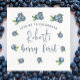 Aniversário de criança! com ilustração aquosa de mirtilos com folhas. O texto diz "baga primeiro".