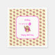 Um guardanapo de aniversário para uma festa de aniversário de dois anos. O texto é totalmente editável: Nome, legenda, saudação. A design apresenta um macaco sorridente segurando um balão rosa brilhante que tem a figura 2. Um outro padrão de macacos em um fundo creme envolve o design principal.