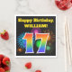Este design de guardanapo de papel vibrante e divertido apresenta um padrão colorido inspirado em fogos de artifício celebratórios, juntamente com o número "17", tendo um padrão de gradiente inspirado no arco-íris multicolor, sobre um fundo de cor preta. Ele também apresenta um nome personalizado e uma mensagem de evento. Os guardanapos de papel como este podem ser usados numa festa de aniversário que está a ser realizada para celebrar o décimo sétimo aniversário de alguém. [~Z0000326]