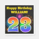 Este design de guardanapo de papel vibrante e divertido apresenta um padrão colorido inspirado em fogos de artifício celebratórios, juntamente com o número "23", que inclui um padrão de gradiente inspirado no arco-íris multicolor, num fundo de cor preta. Ele também apresenta um nome personalizado e uma mensagem de evento. Os guardanapos de papel como este podem ser usados numa festa de aniversário que está a ser realizada para celebrar o vigésimo terceiro aniversário de alguém. [~Z0000326]