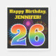 Este design de guardanapo de papel vibrante e divertido apresenta um padrão colorido inspirado em fogos de artifício celebratórios, juntamente com o número "26" com um arco-íris multicolorido como um padrão de gradiente, num fundo preto colorido. Ele também apresenta um nome personalizado e uma mensagem de evento. Os guardanapos de papel como este poderiam talvez ser usados numa festa de aniversário a ser realizada para celebrar o vigésimo sexto aniversário de alguém. [~Z0000326]