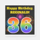 Este design de guardanapo de papel vibrante e divertido apresenta um padrão colorido inspirado em fogos de artifício celebratórios, juntamente com o número "36" com um arco-íris multicolorido como um padrão de gradiente, num fundo preto colorido. Ele também apresenta um nome personalizado e uma mensagem de evento. Os guardanapos de papel como este podem ser usados numa festa que está a ser realizada para celebrar o 36.º aniversário de alguém. [~Z0000326]