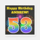 Este design de guardanapo de papel vibrante e divertido apresenta um padrão colorido inspirado em fogos de artifício celebratórios, juntamente com o número "53" com um arco-íris multicolorido como um padrão de gradiente, num fundo preto colorido. Ele também apresenta um nome personalizado e uma mensagem de evento. Os guardanapos de papel como este poderiam talvez ser usados numa festa de aniversário a ser realizada para celebrar o cinquenta terceiro aniversário de alguém. [~Z0000326]