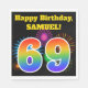 Este design de guardanapo de papel vibrante e divertido apresenta um padrão colorido inspirado em fogos de artifício celebratórios, juntamente com o número "69" com um arco-íris multicolorido como um padrão de gradiente, num fundo preto colorido. Ele também apresenta um nome personalizável e uma mensagem de evento. Os guardanapos de papel como este podem ser usados numa festa a ser realizada para celebrar o sexagésimo nono aniversário de alguém. [~Z0000326]