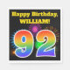 Esta divertida e vibrante design de guardanapo de papel apresenta um padrão de fogos de artifício comemorativos coloridos inspirados, junto com o número "92", tendo um padrão de gradação inspirado no arco-íris multicolor, sobre um fundo de cor preta. Ele também apresenta um nome personalizado e uma mensagem de evento. Os guardanapos de papel como este podem ser usados numa festa que está a ser realizada para celebrar o 92º aniversário de alguém. [~Z0000326]