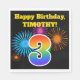 Esta divertida e vibrante design de guardanapo de papel apresenta um padrão de fogos de artifício comemorativos coloridos inspirados, junto com o número "3" tendo um padrão de gradação inspirado no arco-íris multicolor, sobre um fundo de cor preta. Ele também apresenta um nome personalizável e uma mensagem de evento. Os guardanapos de papel como este poderiam talvez ser usados numa festa a ser realizada para celebrar o terceiro aniversário de alguém. [~Z0000326]
