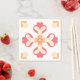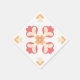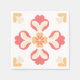 Um design floral simétrico apresenta uma combinação de cor rosa, pêssego e creme em um fundo branco. A flor central é cercada por formas semelhantes a pétalas que formam um padrão cruzado.