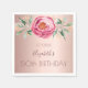 Um guardanapo para uma festa de aniversário feminina e glamourosa 50ª (ou qualquer idade). Um fundo metálico rosa dourado falso. Rosa cor-de-rosa grande, folhas verdes, folhagem com flores ouros pequenas. Um brilho sujo pingava, pintura pingando fita atrás das flores. Personalize e adicione um nome, 50 anos e uma data. O nome é escrito em ouro rosa escuro com um moderno estilo escrito à mão.