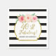 Guardanapos para aniversário de 40 anos com listras pretas e brancas, texto dourado e flores cor-de-água rosa.