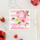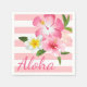 Os guardanapos do coquetel "Aloha" no Havaí têm flores vibrantes tropicais de hibisco, texto personalizado e padrão de fundo de listras rosa e branca.