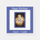Um guardanapo de fotos azul e branco para a festa de primeiro aniversario de um menino. Um quadro azul e fundo branco. Letras azuis e texto: Feliz Aniversário! Um modelo para a sua foto de criança de aniversário, nome e idade.