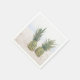 Guardanapos de papel com uma fotografia com um par de abacaxi sentado numa praia arenosa.