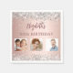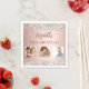 Um guardanapo para uma festa de aniversário feminina e glamourosa 50ª (ou qualquer idade). Um fundo rosa de gradiente dourado decorado com falso confete prateado. O texto: O nome é escrito em ouro rosa escuro com um grande estilo escrito à mão moderno. Personalize e adicione nome, 50 anos e 3 de suas próprias fotos da aniversariante, sua família, amigos ou animais de estimação.