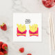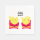 Dois cartoons fritas estão sorrindo, com um deles dizendo, "Fries antes das caras!!". A design colorida e brincalhona adiciona uma mensagem humorística e alegre.