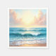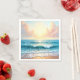 Ondas vagam suavemente em uma praia arenosa sob um céu vibrante cheio de nuvens rosas e fofinhas