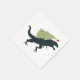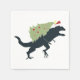 There is something undeniably fun about mixing the Jurassic era with December traditions. This illustration features a funny looking dinosaur who is taking his festive duties very seriously. Donning a classic red Santa hat, this little guy is trekking through the winter vibes carrying a massive Christmas tree on his back.