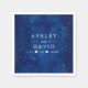 Guardanapo de Casamento Galáxia de Aquarela Estrelas Cósmicas Estrelado. Este design apresenta luzes de estrelas cintilantes no espaço contra um céu estrelado de névoa de uma universo azul celeste. Personalize este design personalizado com seu próprio texto e detalhes do evento.