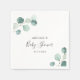 Napê de chá de fraldas neutro por sexo elegante com um simples design com cor d'água pintada com verde de eucalipto verde no canto superior esquerdo e canto inferior direito junto com o nome da futura mãe e a data do evento. Este guardanapo botânico rústico com uma reviravolta moderna é excelente seja para um bebê ou para uma menina.