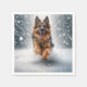 Um German shepherd alegre atravessa um caminho de floresta vitoriosa, chutando a neve suave enquanto ela corre para frente.