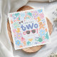 Cute and girly Two Cool birthday napkin for a girl’s summer splash or toddler pool party. Featuring pastel pink water-themed illustrations including a rubber duck, wellies, rainbow, bubbles, watering can, and flowers. Perfect for kids’ birthday tableware, party decor, and coordinated splash party celebrations.