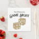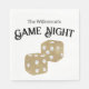 Estes guardanapos personalizados apresentam um tema da noite de jogos. Uma imagem de jogar dados é impressa no centro em um design dourado. A frase "Noite de Jogo" é impressa acima dos dados com um nome de família de amostra. Você pode personalizar os guardanapos para incluir seu próprio nome personalizado ou texto.