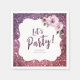 Púrpura brilhante brilha fundo brilhante brilhando e floral cor-de-rosa com script de "festa de vamos" no centro, elegante e na moda, guardanapos de partido personalizados de excelente.
