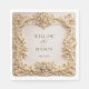 Celebrate your special day with these exquisitely designed wedding paper napkins, featuring a sophisticated gold, cream and ivory color palette. The intricate floral swirl design evokes a sense of timeless romance and classic elegance, perfect for enhancing your wedding reception decor. These napkins add a touch of luxury to any table setting, perfect for the formal or sophisticated wedding theme. Let these beautiful napkins be a charming detail that your guests will remember. The intricate embossed style floral border frames your custom names, creating a sophisticated and timeless feel for your special day. Add this extra wedding accessory to the bar area, the dessert table, cake table or appetizer table.