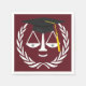 Os guardanapos de festa de formatura da faculdade de direito criativo, com escalas únicas de justiça personificadas vestindo um boné preto e formando de ouro.