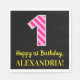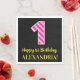 Este divertido design de guardanapo de papel, tema de aniversário, apresenta um grande número "1" com um padrão de rosa claro e cor-de-rosa escuro, juntamente com a mensagem "Happy primeiro aniversario", e um nome personalizável. O fundo é preto colorido. Os guardanapos de papel com tema de aniversário como este podem ser divertidos de usar numa celebração a ser realizada para homenagear alguém que comemora o seu primeiro aniversário. [~Z0000380]