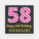 Este divertido design de guardanapo de papel, tema de aniversário, apresenta um grande número de "58", com um padrão cor-de-rosa escuro e listras de rosa claro. Também apresenta a mensagem "Feliz 58º aniversário", e um nome personalizável. O fundo é preto colorido. Alguns guardanapos de papel personalizados e divertidos como este podem ser usados em uma festa de aniversário sendo realizada para celebrar o cinquenta oitavo aniversário de alguém. [~Z0000380]