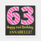 Este divertido design de guardanapo de papel, tema de aniversário, apresenta um grande número de "63" com um padrão de rosas claro e listras cor-de-rosa escuras, juntamente com a mensagem "Feliz 63º aniversário", e um nome personalizável. O fundo é preto colorido. Os guardanapos de papel com tema de aniversário como este podem ser usados numa festa que comemora os sessenta e três anos de alguém. [~Z0000380]